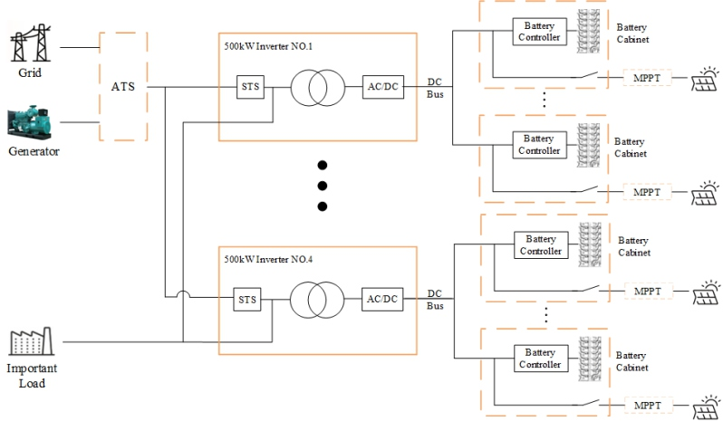 1. Při zátěži nad 500 kW se doporučuje použít velkokapacitní 500 kW jednojednotkový akumulační střídač, který je schopen podporovat až čtyři sady paralelních připojení a dosáhnout tak celkového výkonu 2 MW;