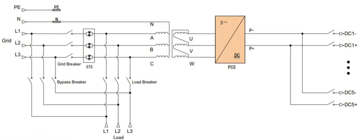 2. Při paralelním provozu více 500 kW systémů a distribuci STS mezi různé 500 kW měniče je důležité zajistit, aby délka kabelu od bodu připojení k síti k bodu připojení zátěže byla konzistentní;
